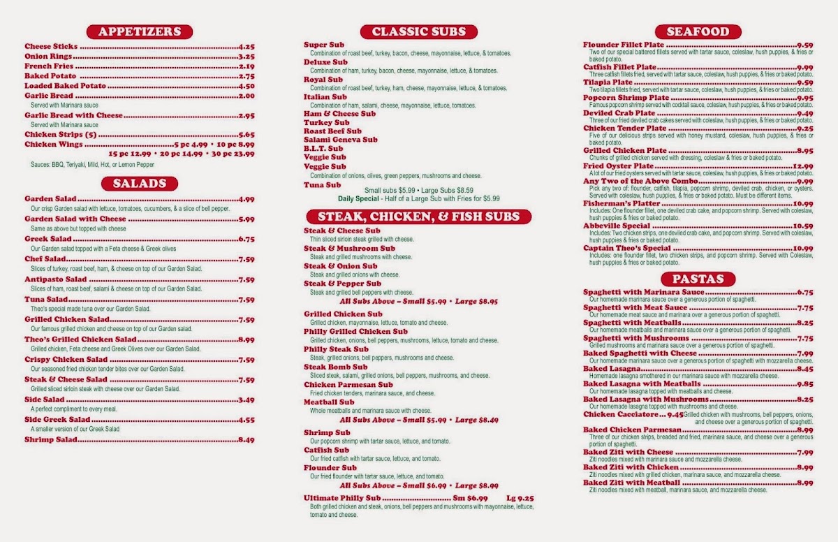 Welcome to Theo's Deli & Seafood, a culinary gem nestled in the heart of Abbeville, SC. Located at 302-1 S Main St, this delightful eatery offers a comforting ambiance and a menu that caters to a variety of tastes. Whether you're in the mood for a fresh seafood delicacy or a hearty deli favorite, Theo's promises to deliver an exceptional dining experience.